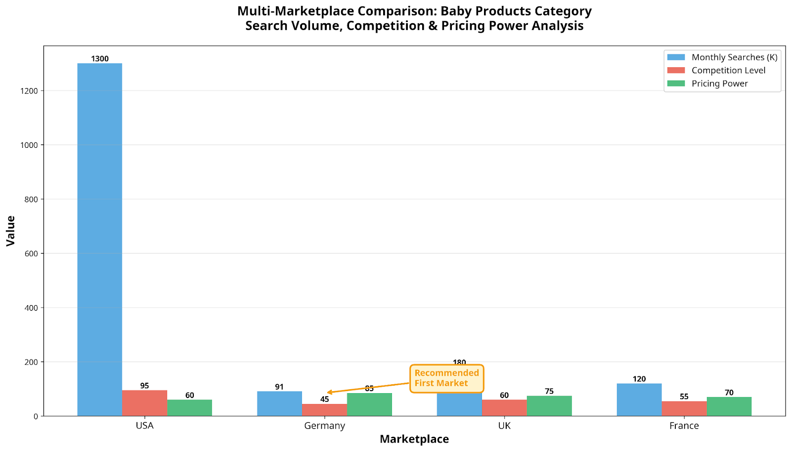 We ran a full Amazon Global Selling Strategy analysis across four marketplaces: the USA, Germany, the UK, and France. Here’s the breakdown we presented.